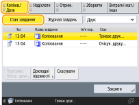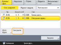 (Стоп) на панелі керування, коли в черзі є завдання копіювання, усі завдання копіювання призупиняться та з’явиться повідомлення <СтопВиберіть завдання копіювання, яке потрібно скасувати.> і список завдань копіювання. Можна вибрати завдання копіювання в списку та скасувати завдання, натиснувши кнопку <Скасувати>. Якщо потрібно поновити копіювання, натисніть <Відновити копіюв.>. |