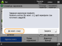 Коли для параметра <Відображати сповіщення про прийняття завдання> встановлено значення <Так>, екран <Монітор стану> можна відкрити з наступного екрана, який відображається після отримання завдання надсилання. <Відображати сповіщення про прийняття завдання>