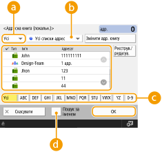 За допомогою кнопок <Реєстр. нов. адресата>, <Докл. відом./Редагувати> і <Видалити> у меню <Реєструвати/редагувати> на екрані Адресна книга (локальн.) можна зареєструвати нових адресатів, перевірити деталі, а також редагувати або видалити адресатів.