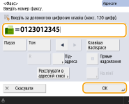 Надсилання факсів за кордонВведіть міжнародний номер доступу, код країни та номер факсу в зазначеному порядку. Якщо не вдається з’єднатися з адресатом за кордоном, натисніть <Пауза>, щоб вставити паузу між кодом і подальшим номером.