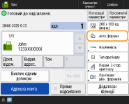 Завдання надсилання через факс/інтернет-факс: <Пріоритет якості> (<Пріоритет швидк./якості зображ. для Ч/Б сканування>)Якщо зазначено декілька телефонних лінійМожна вибрати телефонну лінію, яка використовуватиметься для надсилання факсів. Для цього натисніть <Додаткові функції>