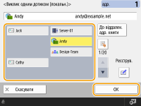 <Орієнт. вмісту оригіналу> виберіть <Верхня частина нижнього поля> або <Верхня частина бічного поля> відповідно до орієнтації оригіналу натисніть <OK>.Зазначення кількох адресатів, зокрема факсівУстановіть для параметра <Увімкнути факс під час дії функції Сканувати та надіслати> значення <Увімк.>, щоб указати адресатів факсу на екрані основних функцій сканування (<Відображати функцію факсу>). Цей параметр корисно використовувати для зазначення кількох адресатів, зокрема факсів, наприклад, під час збереження копії надісланого факсу на файловому сервері.