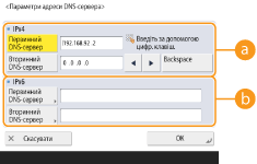 Натисніть вкладку <Первинний DNS-сервер> і введіть IPv6-адресу DNS-сервера. Не можна вводити адреси, що починаються з «ff» (групові адреси), адреси, що складаються лише з «0» або адреси локальних посилань.