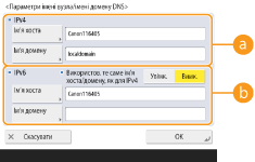 Щоб імена хоста та домену були такими самими, що й для IPv4, натисніть значення <Увімк.> для параметра <Використов. те саме ім’я хоста/домену, як для IPv4>. Щоб вони відрізнялися від IPv4, натисніть <Вимк.>.