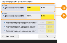 Щоб інформація автоматично оновлювалася, коли відповідність між ім’ям хоста і IP-адресою змінюється в такому середовищі, як DHCP, натисніть <Увімк.> у розділі <Динамічне оновлення DNS>.