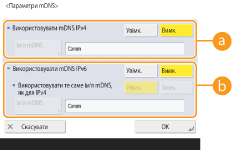 Щоб установити такі самі параметри, що й для IPv4, для імені mDNS, натисніть значення <Увімк.> для параметра <Використовувати те саме ім’я mDNS, як для IPv4>. Щоб використовувати різні параметри, натисніть пункт <Ім’я mDNS> і введіть ім’я mDNS за вашим вибором, використовуючи буквено-цифрові символи.