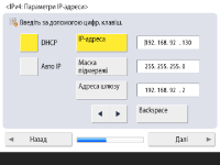 Щоб установлювати IP-адресу вручну, зніміть прапорець для параметра <DHCP> або <Авто IP>, натисніть <IP-адреса>, <Маска підмережі> і <Адреса шлюзу>, щоб увести кожне значення, і натисніть <Далі> або <OK>.