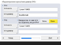 Натисніть вкладку <Ім’я хоста>, щоб ввести ім’я апарата (ім’я хоста). Натисніть вкладку <Ім’я домену>, щоб ввести ім’я домену, до якого належить апарат, і натисніть <Далі>.