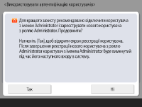 Щоб посилити безпеку пристрою, вимкнувши користувача «Адміністратор» та зареєструвавши нового адміністратора, натисніть <Так>. У розділі <Зареєструвати адміністратора> введіть <Ім’я користувача> та <Пароль>, а потім натисніть <OK>. Укажіть <Адреса електронної пошти>, <Ідентиф. відділу> і <Відображуване ім’я>, якщо це необхідно. Додаткову інформацію див. в розділі Реєстрація інформації користувачів на локальному пристрої. Користувача «Адміністратор» буде вимкнено під час наступного входу.