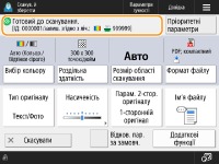 Відображає стан параметрів, як-от роздільна здатність і розмір сканованого файлу. Підтвердьте параметри, щоб сканування виконувалось належним чином. Щоб змінити параметри, натисніть кнопку під розділом відображення. Щоб дізнатися більше про формати файлів, див. розділ