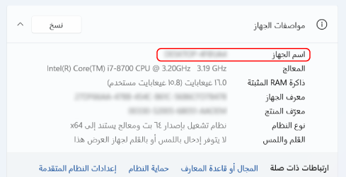 من [مواصفات الجهاز]، اعرض اسم الكمبيوتر وإصدار نظام التشغيل.