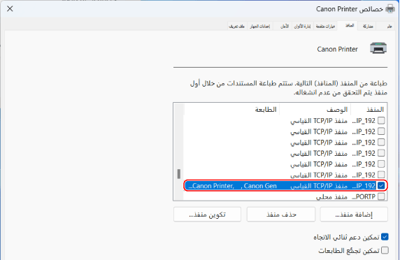 من علامة التبويب [المنافذ]، تحقق من تحديد مربع الاختيار [تمكين دعم ثنائي الاتجاه].