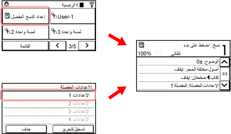يمكنك استدعاء الإعدادات المسجلة للتشغيل السريع باستخدام زر [إعداد النسخ المفضل] على الشاشة [الرئيسية] أو من شاشة وظيفة النسخ. يمكنك أيضًا تغيير الإعدادات بعد استدعائها، حسب الحاجة.