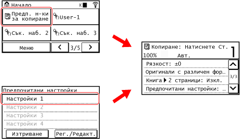 Можете да извикате регистрирани настройки за бърза работа от бутона [Предп. н-ки за копиране] на екрана [Начало] или от екрана на функцията за копиране. Можете също така да промените настройките, след като ги извикате, ако е необходимо.