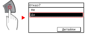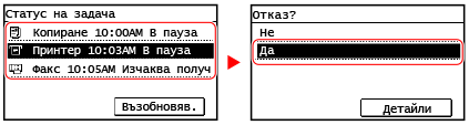 на контролния панел  [Задача за копиране/отпечатване]  [Статус на задача]  изберете задачата, която трябва да се отмени, на екрана [Статус на задача печат]  [Отказ]  [Да]