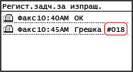 Ако отпечатването не може да се извърши или сканирани данни или факс не могат да бъдат изпратени или получени, или възникне друга грешка, в отчета или регистъра на заданията се показва код на грешка (трицифрено число, започващо с „#“).