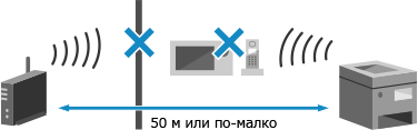 Устройството и безжичният LAN рутер трябва да бъдат инсталирани на място без стени или други препятствия между устройствата и разстояние до 50 м.