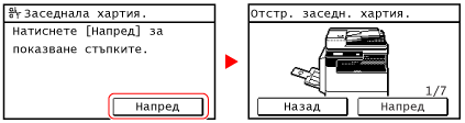 Не изваждайте със сила заседнала хартия от машината.Изваждането на хартията със сила може да доведе до нараняване или повреда на части на машината. Ако не можете да извадите хартията, обърнете се към вашия търговец или сервизен представител.