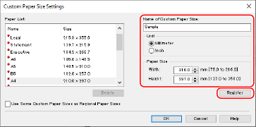 Unesite naziv papira prilagođene veličine i veličinu papira pa kliknite [Register].
