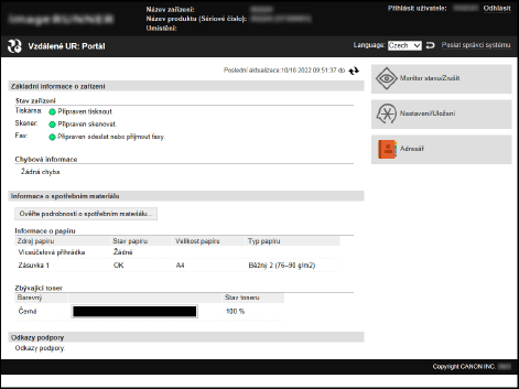 Když se přihlásíte do vzdáleného uživatelského rozhraní, zobrazí se stránka portálu (domovská stránka vzdáleného uživatelské rozhraní). Odsud můžete kontrolovat provozní stav zařízení, zobrazovat různé informace a měnit nastavení pomocí operací s tlačítky.