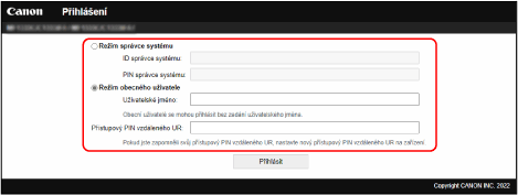 Chcete-li používat vzdálené UR, zadejte do webového prohlížeče v počítači IP adresu zařízení a přihlaste se pomocí režimu správce nebo režimu obecného uživatele. Funkce dostupné ve vzdáleném UR se liší v závislosti na režimu, do kterého jste se přihlásili.