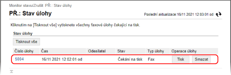 Po kliknutí na tlačítko [Tisknout vše] se vytisknou všechny faxy uložené v paměti.
