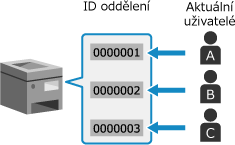 Přiřaďte ID oddělení uživatelům a skupinám podle prostředí použití a účelu. Nastavení PIN k ID oddělení navíc může zabránit neoprávněnému přístupu a umožnit přísnější správu.