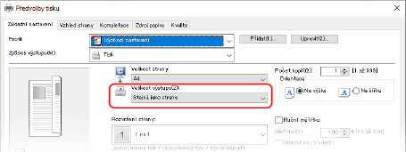 Nastavte [Výstupní velikost] v ovladači tiskárny podle velikosti papíru, na který chcete tisknout.