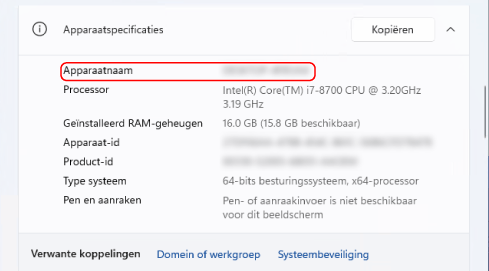 In [Apparaatspecificaties] bekijkt u de computernaam en de versie van het besturingssysteem.