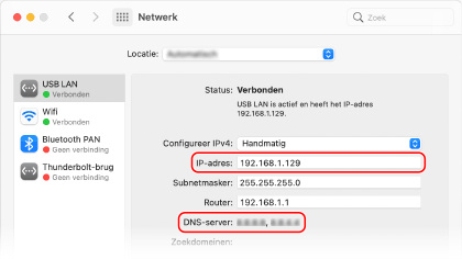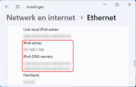 In [Eigenschappen] bekijkt u IP-adres en DNS-server.