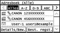 Als u het adresboek oproept van het scherm [Start] of scan- of fax-scherm, verschijnt het volgende scherm.