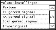 U kunt het volume van de volgende meldingsgeluiden aanpassen: Bij het verzenden of ontvangen van een fax, wanneer een faxverzending is voltooid, wanneer een faxontvangst is voltooid, of wanneer het scannen van faxoriginelen is voltooid.