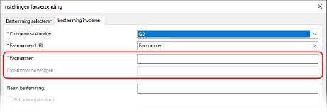 Op het tabblad [Bestemming invoeren] voert u een faxnummer in. Als [Faxnummer bevestigen] kan worden ingevoerd, voert u hetzelfde faxnummer in.