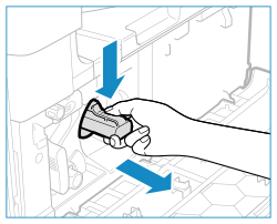 Ondersteun de nieuwe tonercartridge met één hand, terwijl u de cartridge met uw andere hand in de machine duwt.