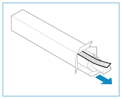 Houd de tonercartridge met één hand op zijn plaats en verwijder de afdichtingstape met de andere hand door deze in een rechte lijn naar buiten te trekken.