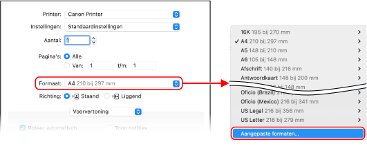 In [Formaat] van de afdrukopties selecteert u [Aangepaste formaten].