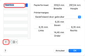 Klik op [+] links onderaan, dubbelklik op [Naamloos] en voer de naam van het aangepaste papierformaat in.