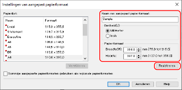 Voer naam en formaat van het aangepaste papier in en klik op [Registreren].