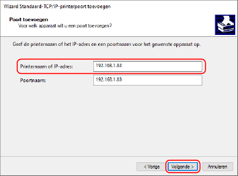 Als u een standaard TCP/IP poort toevoegt: Het IP-adres of de DNS naam (hostnaam) van het apparaat