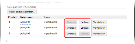 Klik op [Omhoog] of [Omlaag] rechts van de beleidsnaam om de prioriteit in te stellen. Een beleid met hoger niveau heeft prioriteit bij toepassing voor IPSec-communicatie.