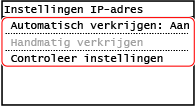 Gewoonlijk stelt u dit in op [DHCP]. Maar als [DHCP] is ingesteld in een omgeving waar DHCP niet kan worden gebruikt, blijft het apparaat Auto Acquire in het netwerk bevestigen, wat onnodige communicatie geeft. Als u DHCP niet gebruikt, stelt u dit in op [Uit].