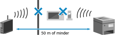 Het apparaat en draadloos-LAN-router moeten op een locatie zijn geïnstalleerd zonder wanden of andere belemmeringen tussen de apparaten en binnen een bereik van 50 m.