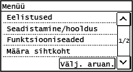 Sätete automaatne tühistamineKui teatava aja möödudes ei ole mingeid toiminguid tehtud, kustutatakse vaikimisi ekraanilt määratavad sätted ja ilmub kuva [Avamenüü]. Te saate muuta sätete kustutamiseni jäetud aega ja seejärel ilmuvat kuva.