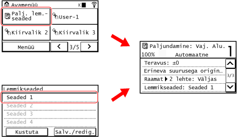 Saate kuvada registreeritud sätteid kiiresti kasutamiseks nupuga [Palj. lem.- seaded] kuval [Avamenüü] või paljundamise funktsiooni kuval. Samuti saate sätteid pärast nende kuvamist vastavalt vajadusele muuta.