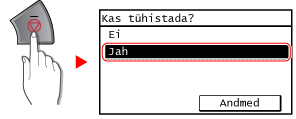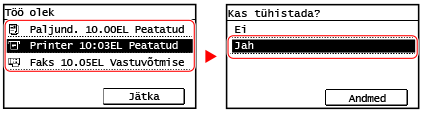 juhtpaneelil  [Paljundus-/prinditöö]  [Töö olek]  valige [Prinditöö olek] ekraanil tühistatav töö  [Tühista]  [Jah]