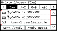 Όταν καθορίζετε προορισμούς με κλήση του Βιβλίου διευθύνσεων από την οθόνη [Αρχική] ή την οθόνη σάρωσης ή φαξ, χρησιμοποιήστε τη λίστα προορισμών.