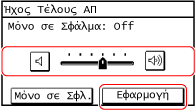 Για να εκπέμπεται ήχος ολοκλήρωσης μόνο όταν παρουσιάζεται σφάλμα, πατήστε [Μόνο σε Σφλ.] και ορίστε σε [On].