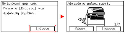 Μην αφαιρείτε το μπλοκαρισμένο χαρτί τραβώντας το με δύναμη από τη συσκευή.Εάν αφαιρέσετε το χαρτί ασκώντας δύναμη, μπορεί να τραυματιστείτε ή να προκληθεί βλάβη στα εξαρτήματα της συσκευής. Εάν δεν μπορείτε να αφαιρέσετε το χαρτί, επικοινωνήστε με τον αντιπρόσωπο ή την τεχνική υπηρεσία.