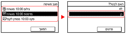 בלוח הבקרה  [משימת הדפסה/צילום]  [מצב משימה]  בחר את העבודה שיש לבטל במסך [מצב משימת הדפסה]  [ביטול]  [כן]