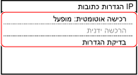 בדרך כלל, מוגדר ל-[DHCP]. עם זאת, במצב ש-[DHCP] מוגדר בסביבה שבה לא ניתן להשתמש ב-DHCP, המכשיר ימשיך לאשרAuto Acquire ברשת, וייצור תקשורת מיותרת. כאשר אינך משתמש ב-DHCP, הגדר זאת ל-[כבוי].